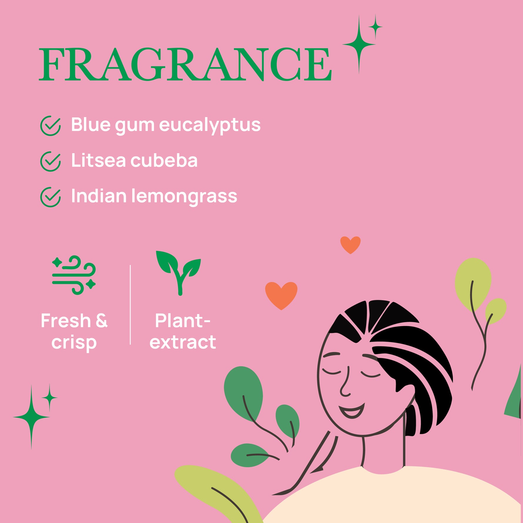 • Essential oils (eucalyptus, litsea cubeba, lemongrass) - USDA-certified organic essential oils that provide a fresh, clean scent while contributing functional benefits.